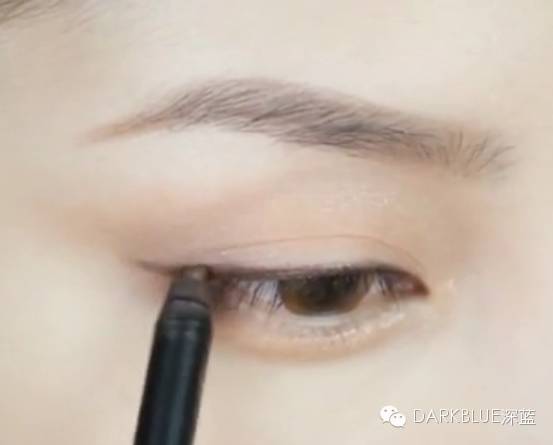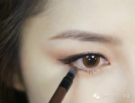 用黑色眼线笔化内眼线,再用棕色化外眼线。眼尾化的稍粗一些向上轻挑。