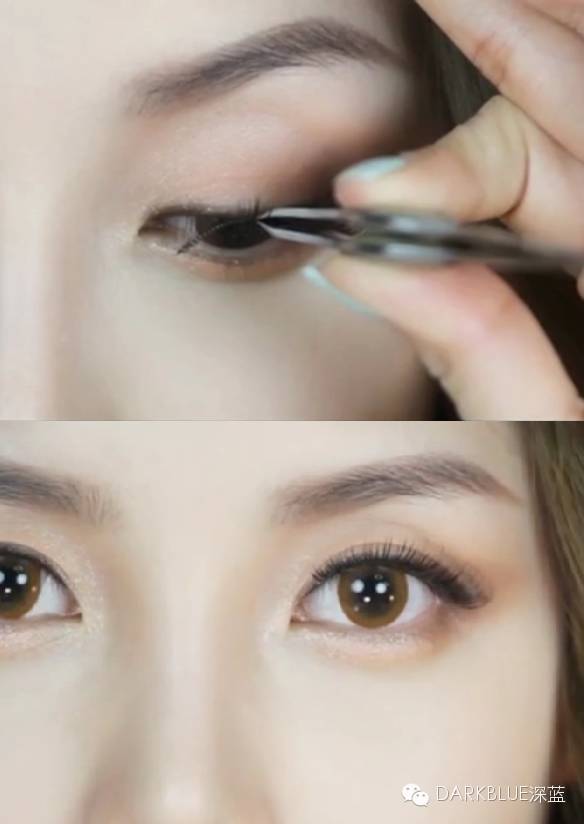 用睫毛夹夹好睫毛后,粘上比较卷翘自然的假睫毛。