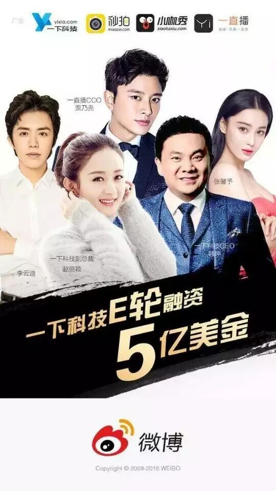 说到一下科技大家可能还不熟悉,不过呢,说到小咖秀、一直播、秒拍,大家肯定都有用过吧,而一下科技就是其母公司,今天刚宣告获E轮融资5亿美元,由新浪微博领投,上海广播电视台、上海文化广播影视集团有限公司旗下产业投资基金等共同投资,赵丽颖出任副总裁。