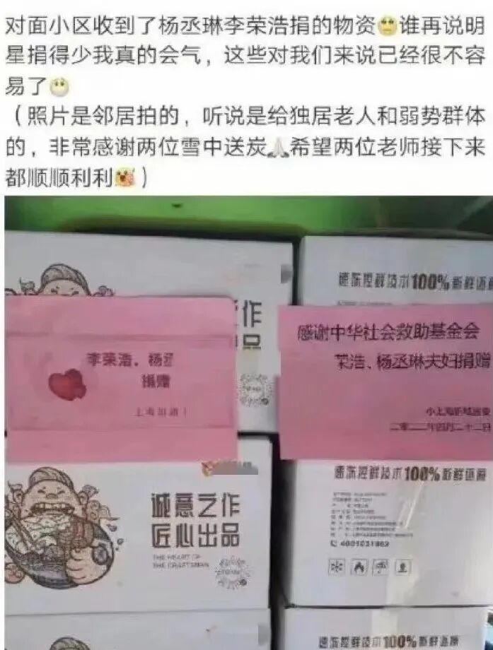 因为就这两天,李荣浩杨丞琳还以夫妻名义共同给上海独居老人捐赠了物资,做善事都没忘一起。