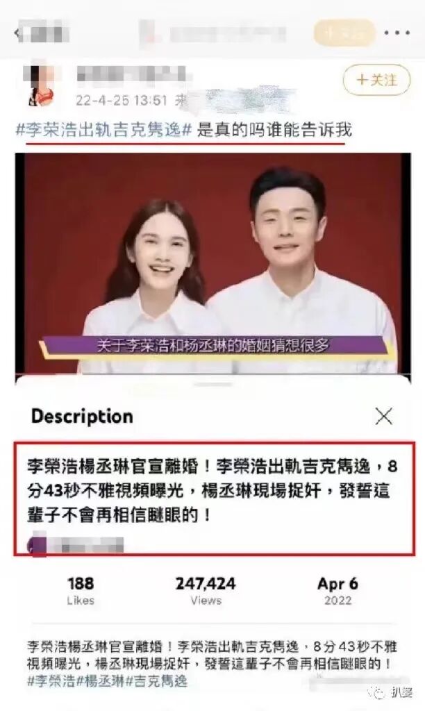 该爆料账号言之凿凿地说,李荣浩为了吉克隽逸和杨丞琳离了。