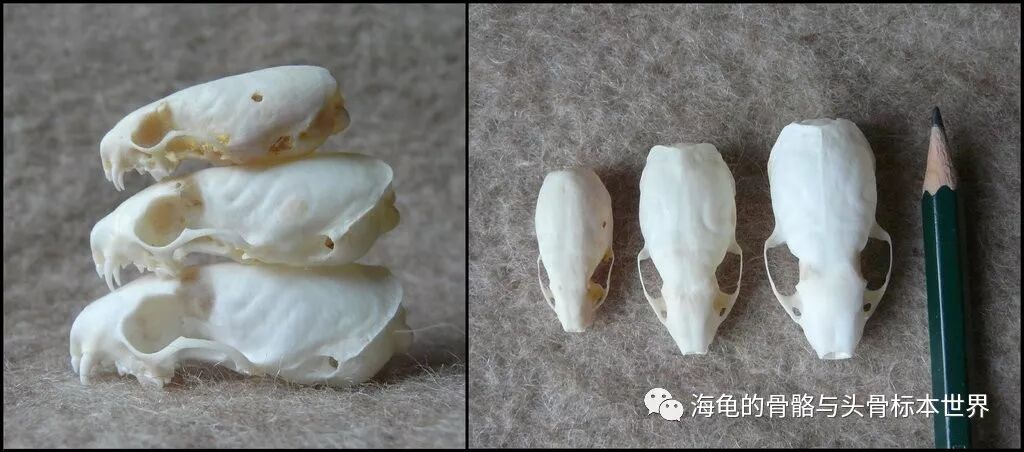 大至小:白鼬(Stoat 4cm)、伶鼬指名亚种(Least Weasel 3,5cm)、伶鼬东北亚种(Pygmy Weasel3cm)
