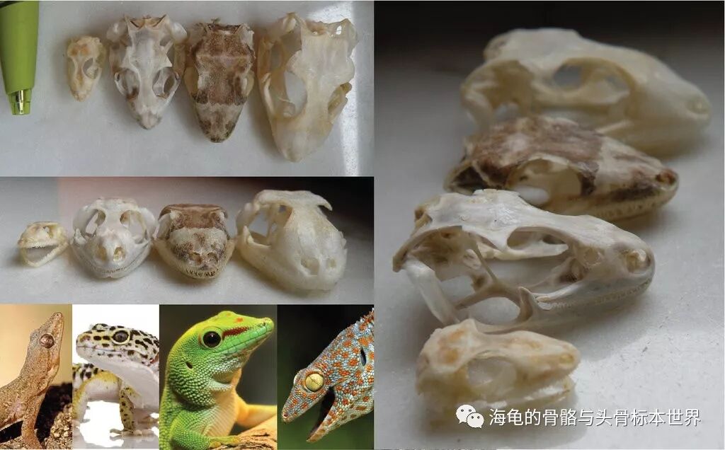 左至右:普通壁虎(Common house gecko)、豹纹守宫( Leopard gecko)、大壁虎(Giant day gecko)、托凯壁虎(Tokeh gecko)