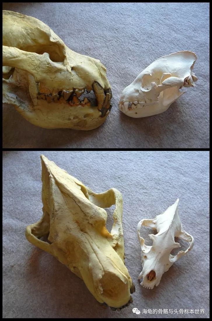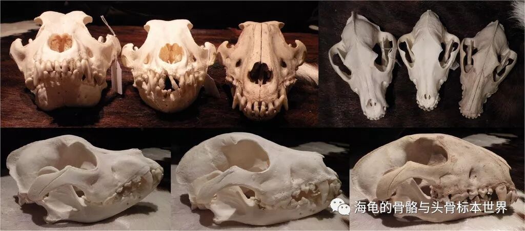 左至右:灰狐(Grey fox),红狐-野生(red fox (wild))、红狐-人工饲养(red fox (ranched))、郊狼(coyote)、灰狼(grey wolf)