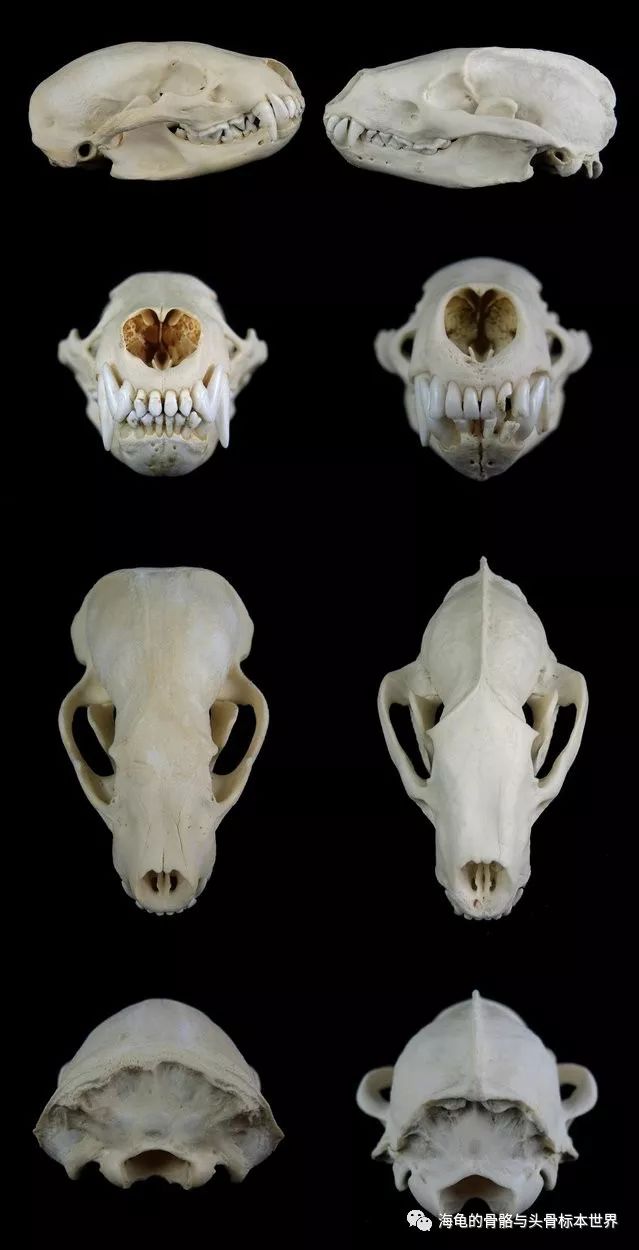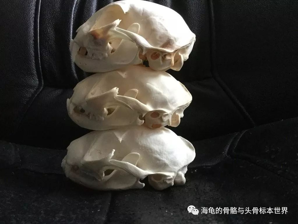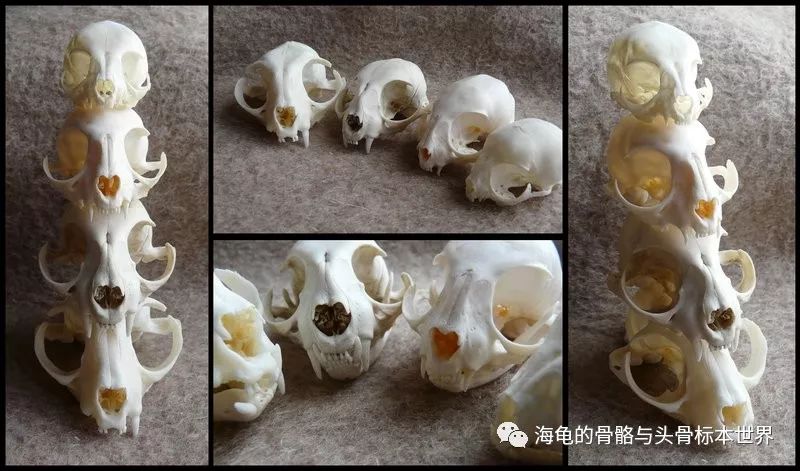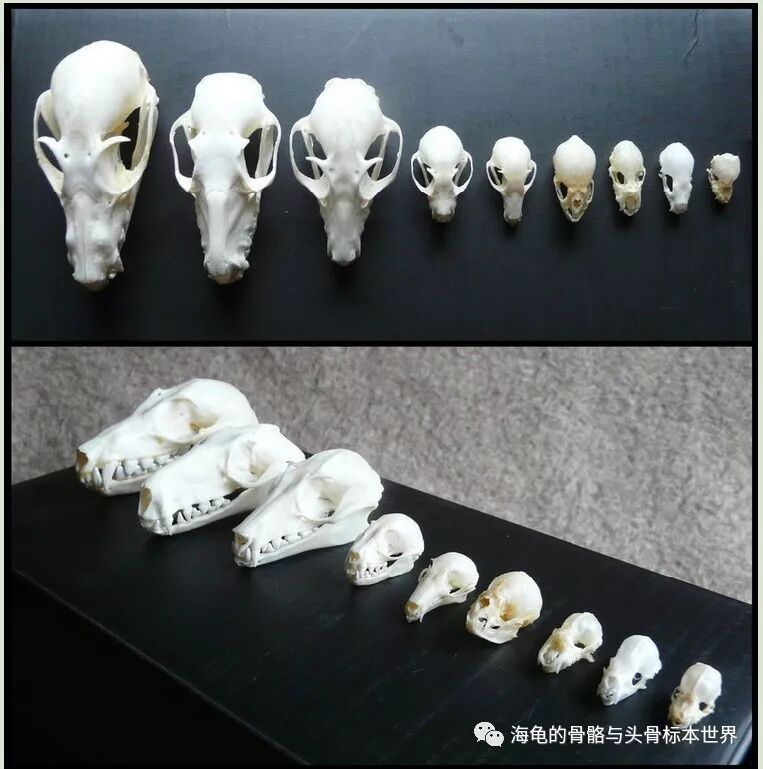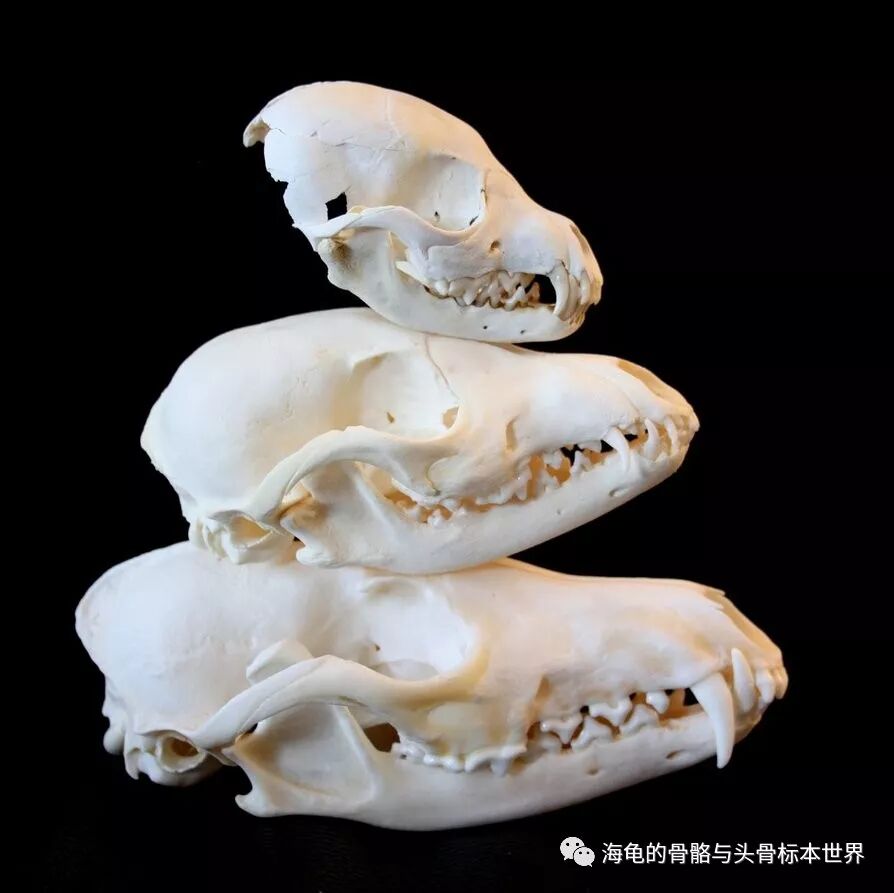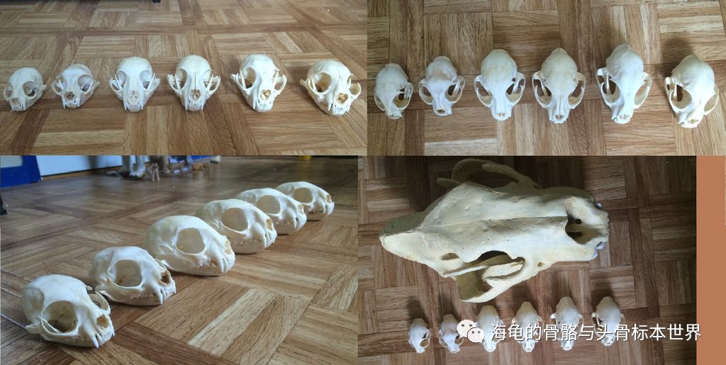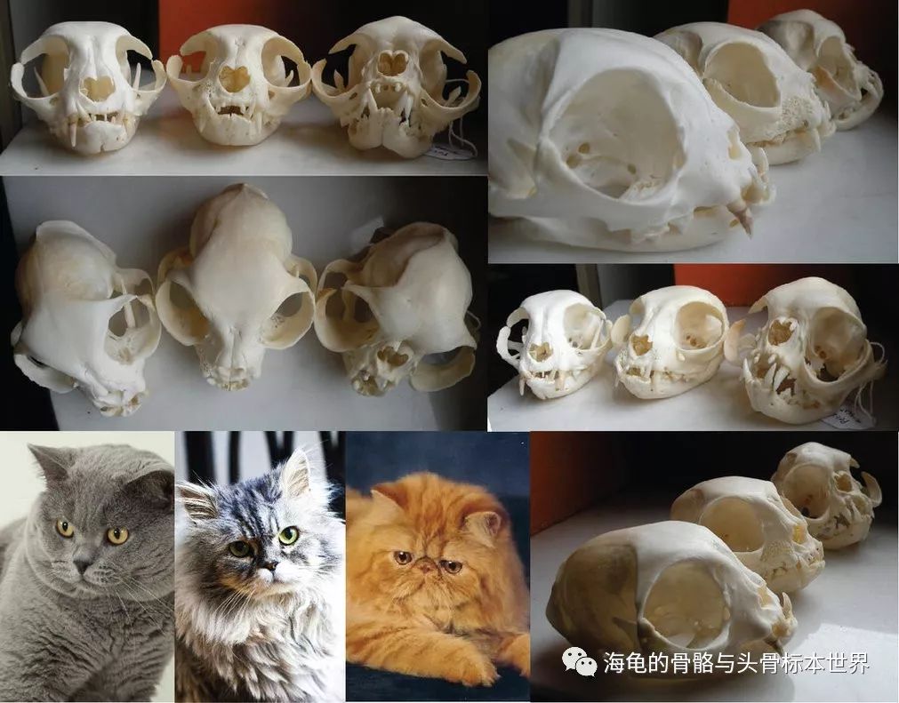 不同年龄的猫头骨,上至下:1周,5月,成年,老年