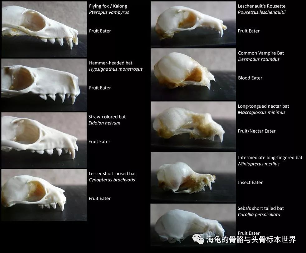 大至小,上至下,左至右:狐蝠( Flying fox)、锤头果蝠(Hammer-headed bat )、黄毛果蝠(Straw-colored bat)、短耳犬蝠(Lesser short-nosed bat)、棕果蝠(Leschenault's rousette)、吸血蝠(Common vampire bat)、小长舌果蝠(Long-tongued nectar bat)、短尾叶鼻蝠(Seba's short tailed bat)、南长翼蝠(Intermediate long-fingered bat )