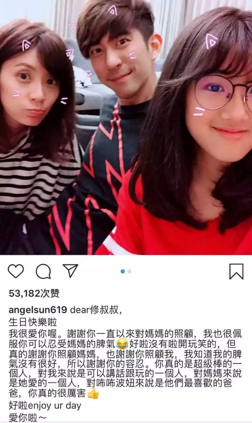 配图是贾静雯和女儿梧桐妹分别与后爸修杰楷、亲爸孙志浩的合影。
