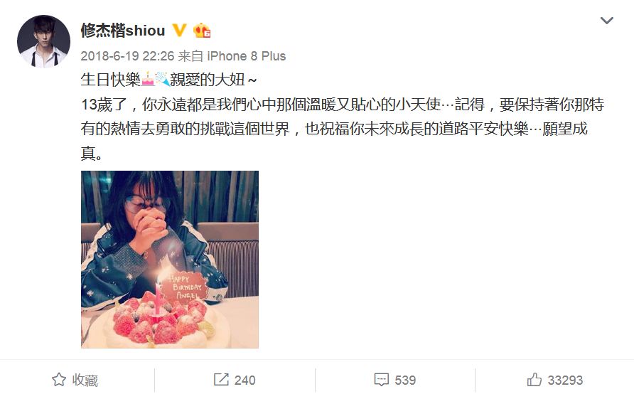 两人关系也超好,梧桐妹在修杰楷生日当天发文,感谢他的照顾和包容。
