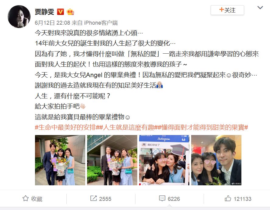 起源是贾静雯微博晒出参加了大女儿梧桐妹毕业典礼,并发文称“因为无私的爱把我们凝聚起来,很奇妙......这就是给我宝贝最棒的毕业礼物。”