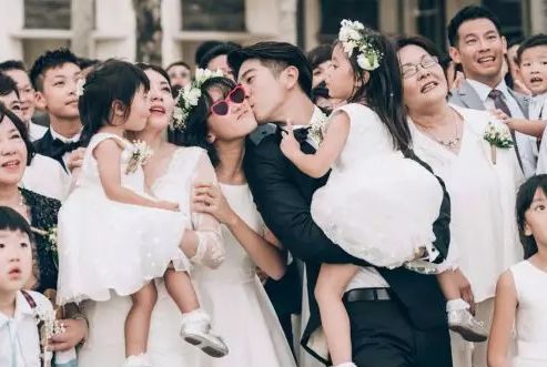 在三个美丽的女儿和家人的见证下,两人完成了婚礼仪式。一家人的幸福简直要溢出来了。