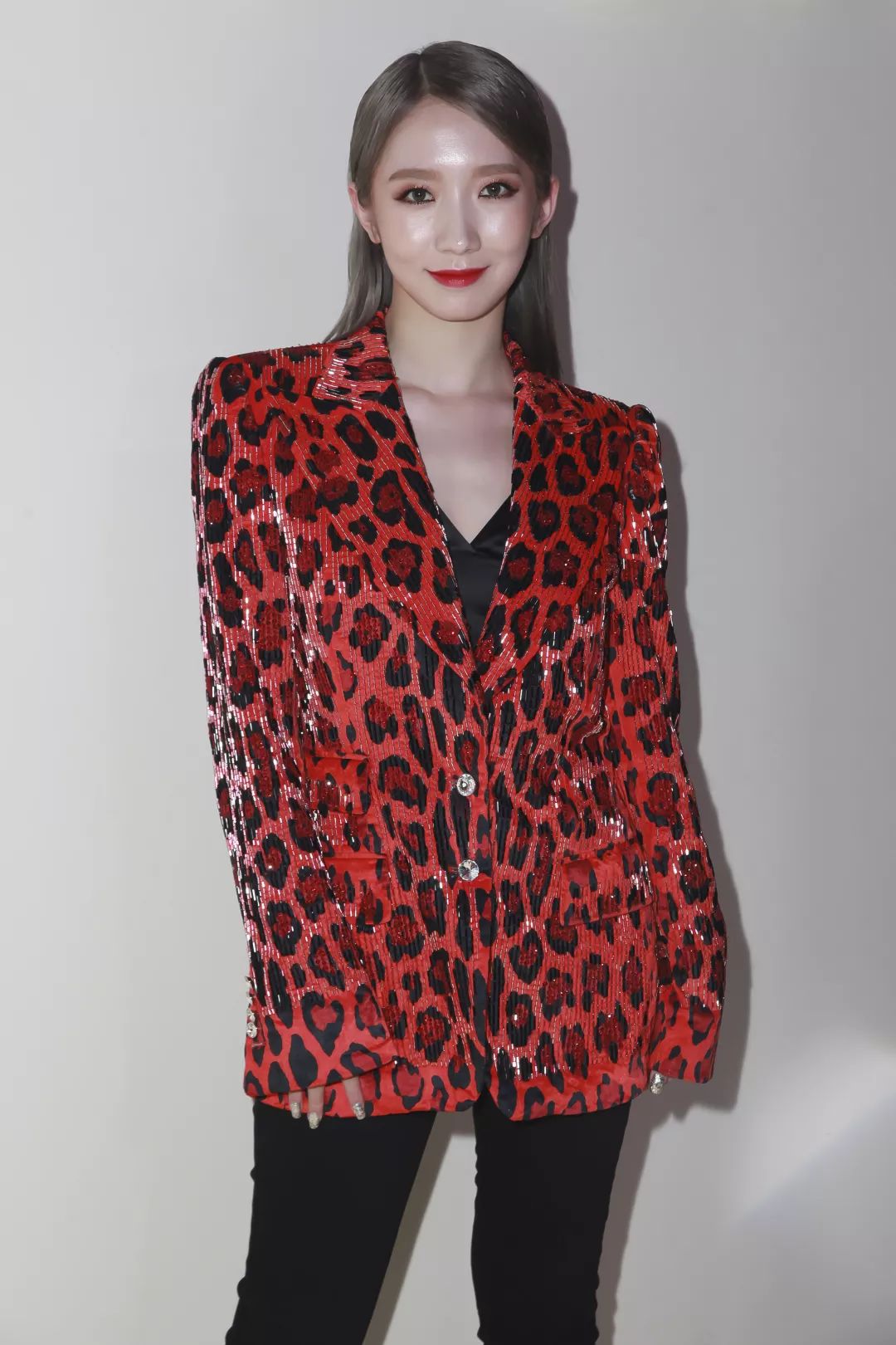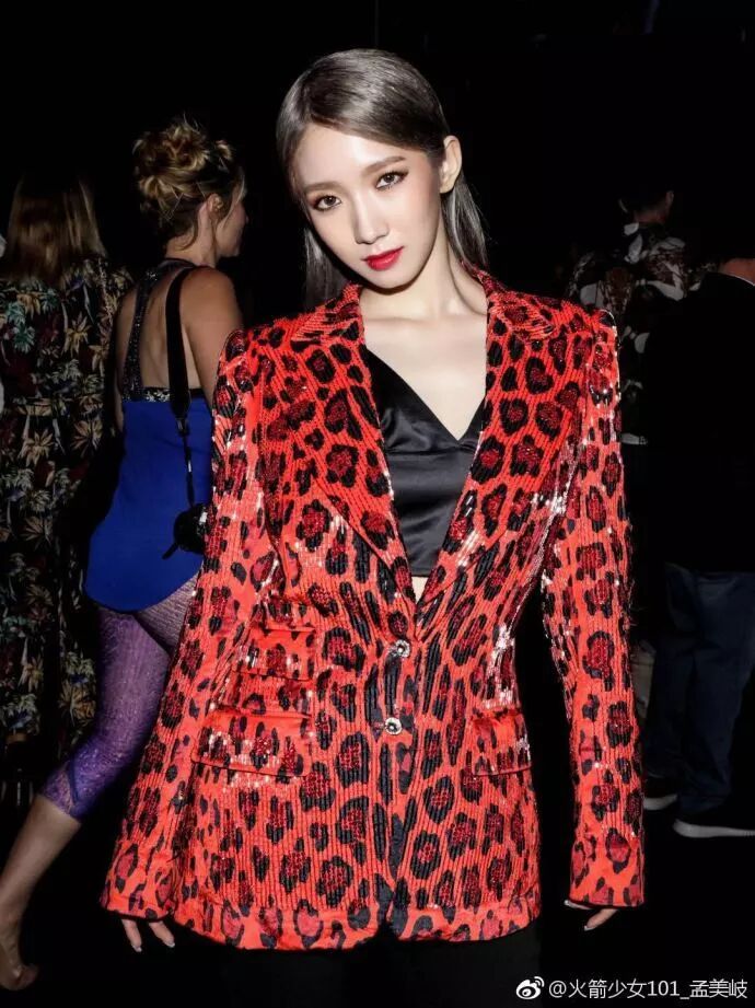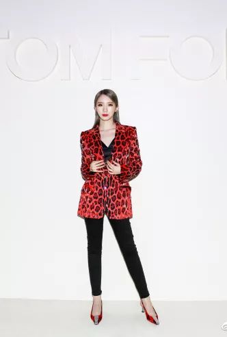 同样首次出现在Tom Ford秀场上的孟美岐要比吴谨言大胆很多,她只有一套衣服,就是这身豹纹西装……