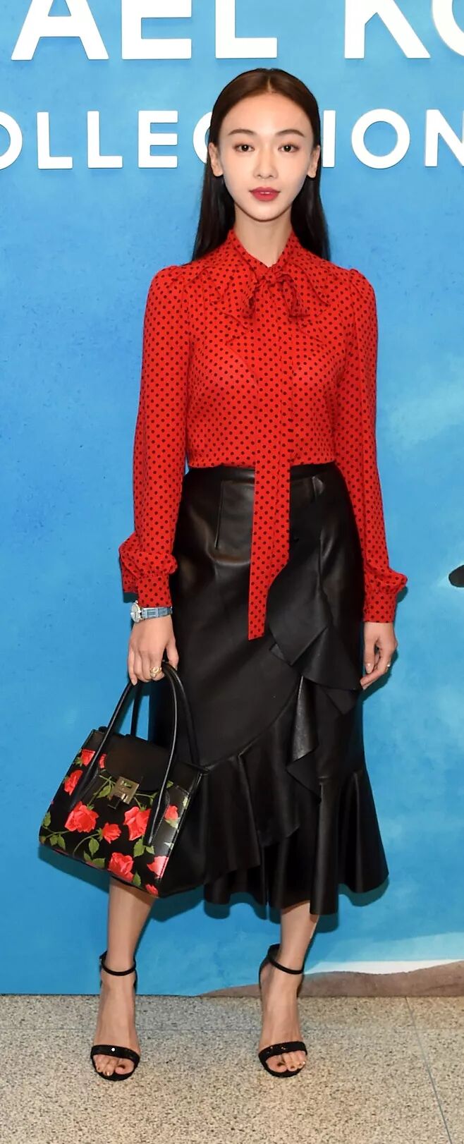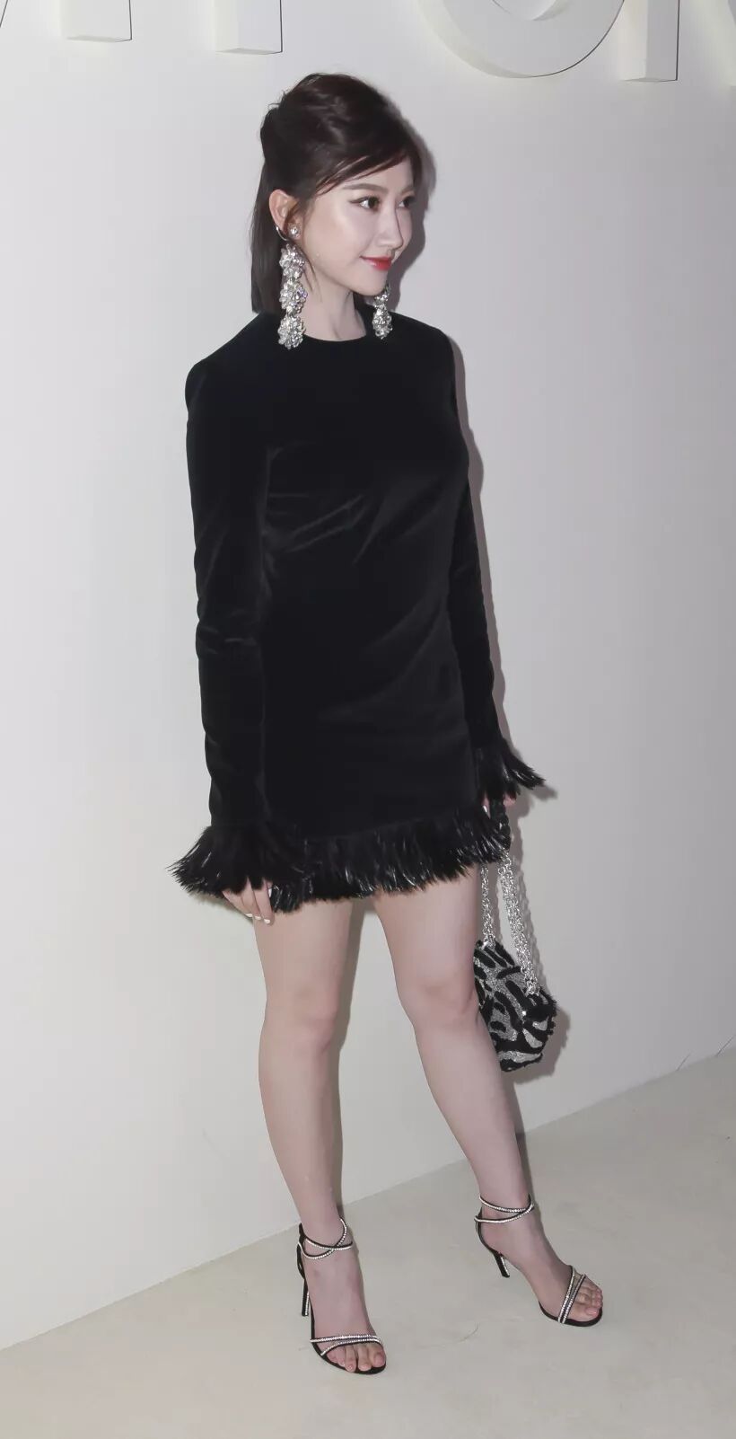 景甜丝绒短裙则秀了美腿,还很凸显腰身。