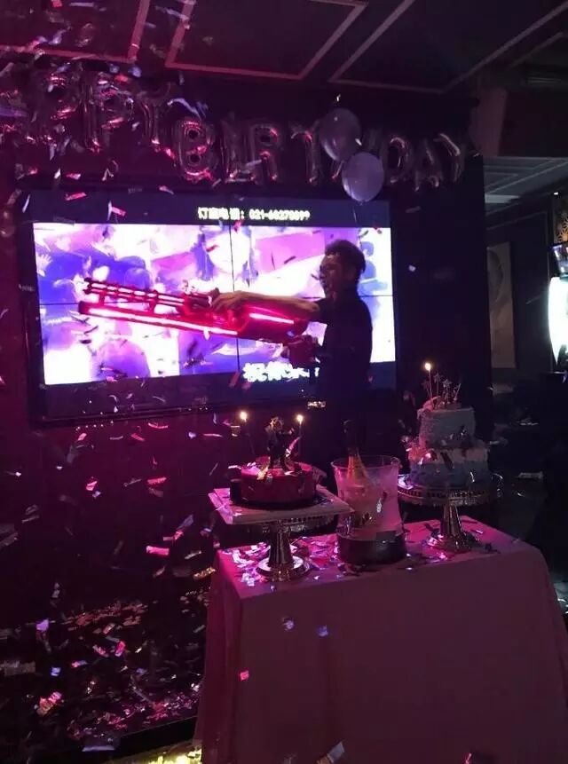 吴亦凡在会场手拿一把巨大的玩具枪做出扫射的样子,他身旁的桌子上还摆放着两个蛋糕。