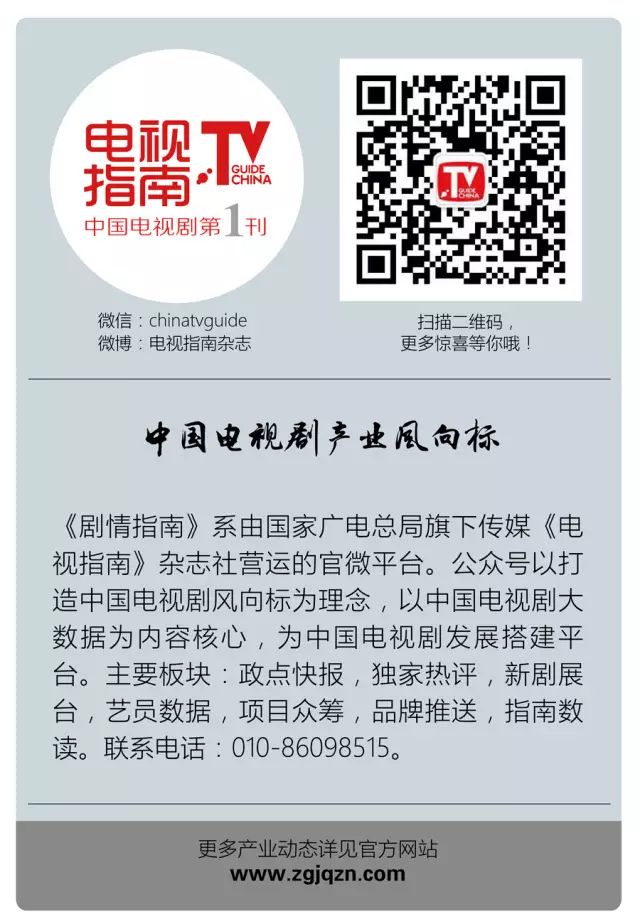 《剧情指南》系由国家广电总局旗下传媒《电视指南》杂志社营运的官微平台。公号以打造中国电视剧风向标为理念,以中国电视剧大数据为内容核心,为中国电视剧发展搭建平台。主要板块:政点快报,独家热评,新剧展台,艺员数据,项目众筹,品牌推送,指南数读。