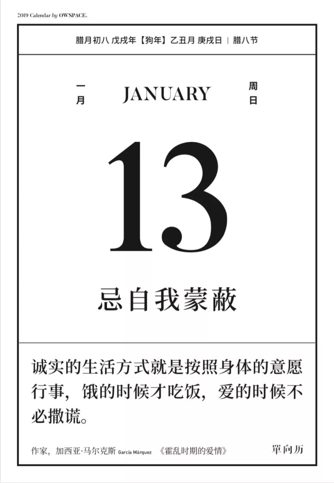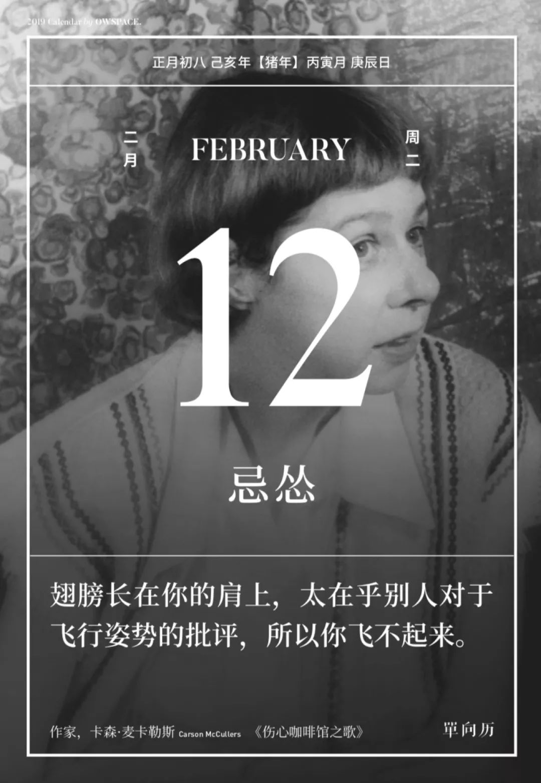 当你为了某个重大决定而犹豫不决,单向历 2019 会告诉你——“忌怂”;配上《伤心咖啡馆之歌》里的那句话鼓励你。