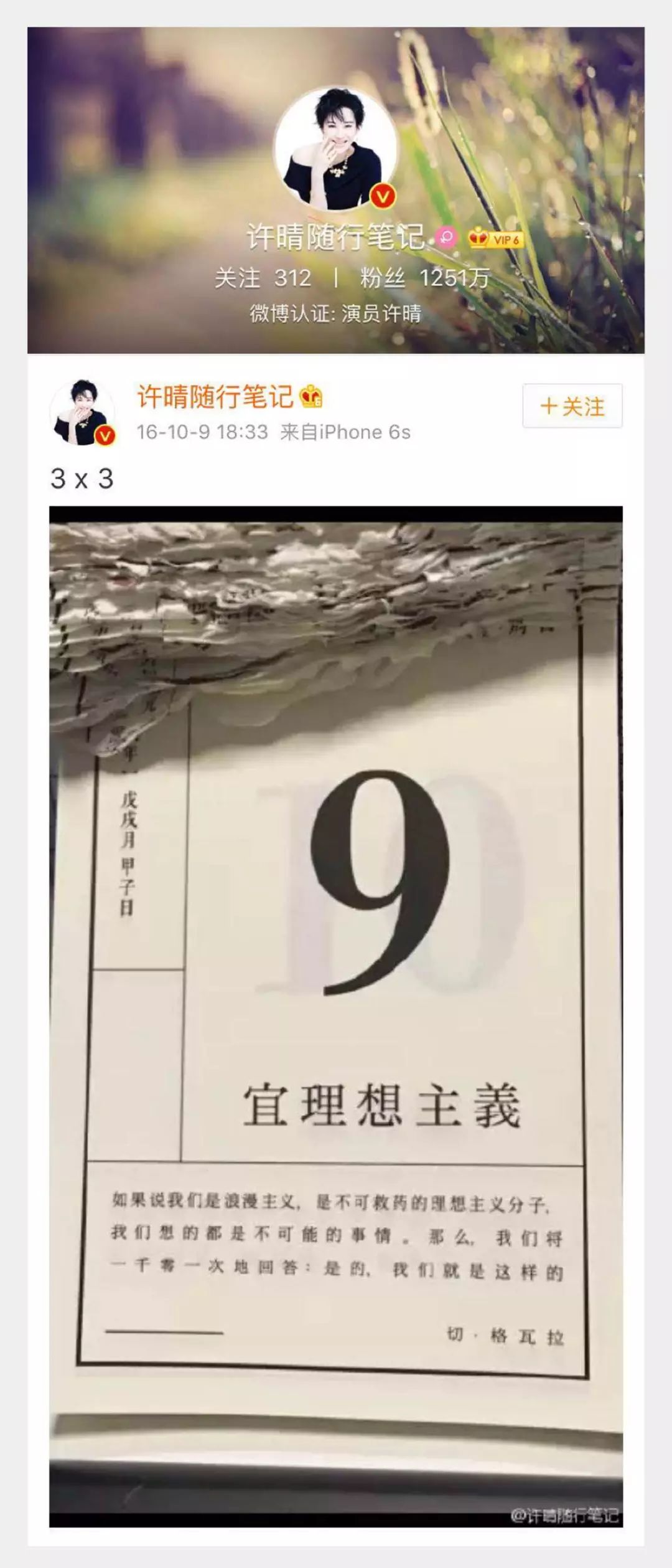 许晴也曾经在微博上晒出一页单向历,分享给每一个和切·格瓦拉一样“宜理想主义”的人: