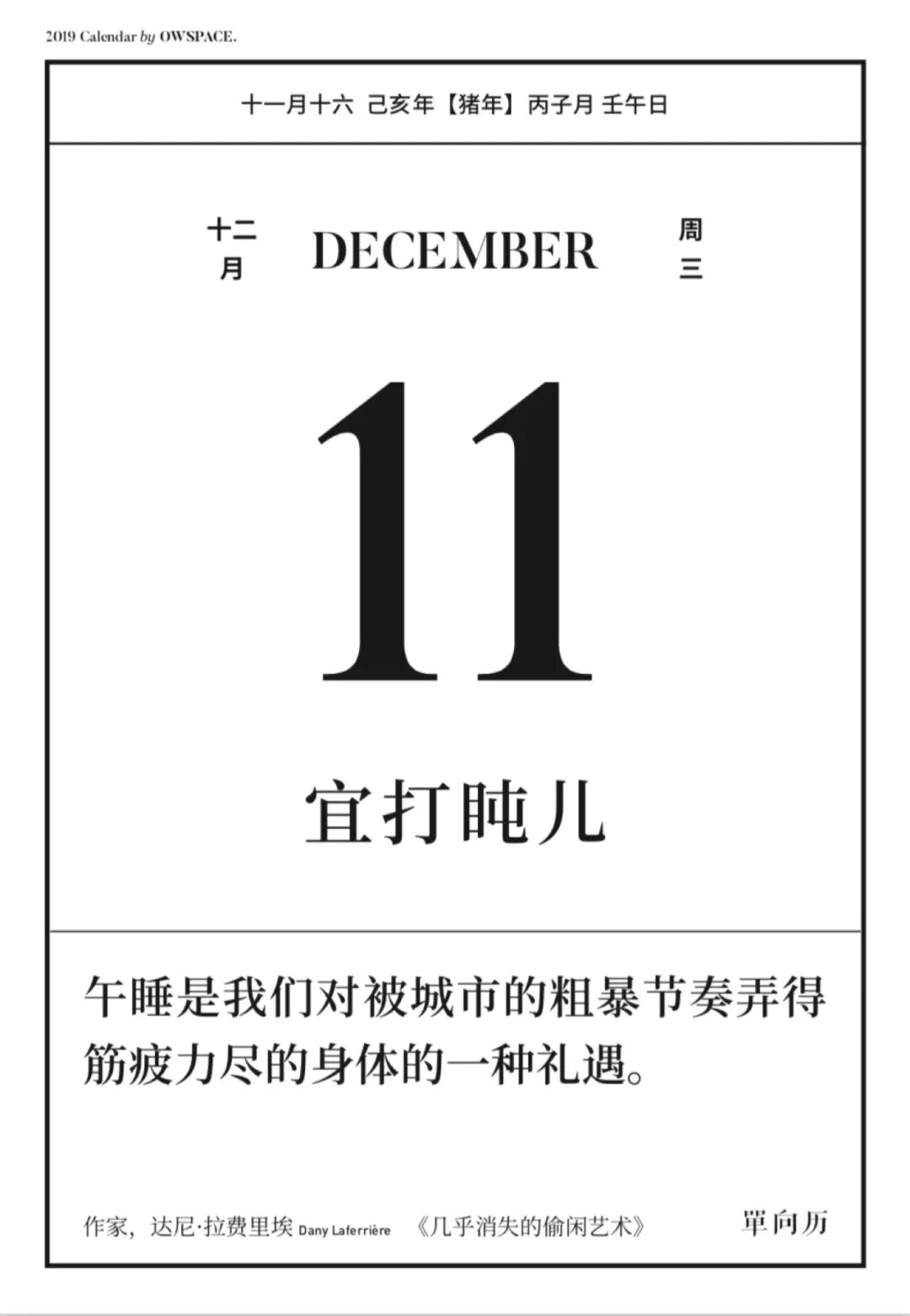 当你想要忙里偷闲,单向历 2019 会说“宜打盹儿”——理论来自《几乎消失的偷闲艺术》,你应该理直气壮地午睡。