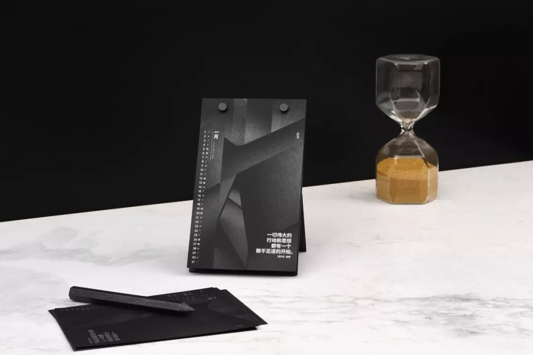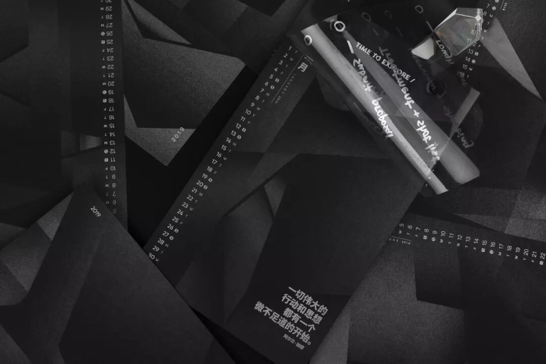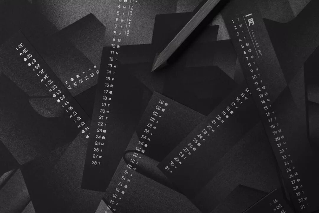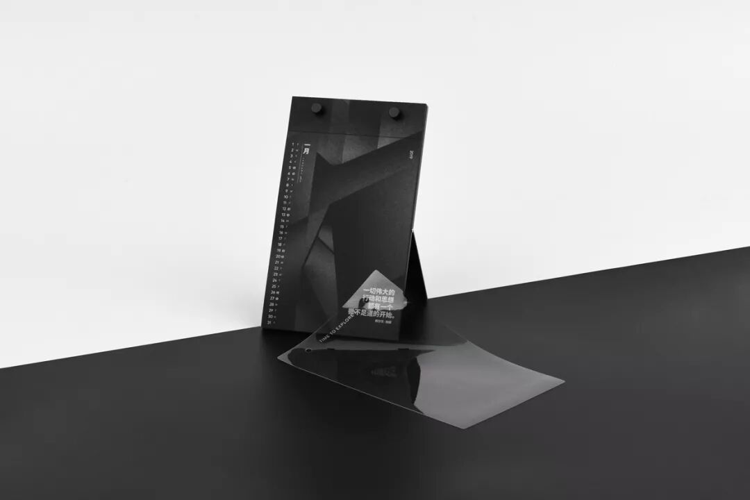 整个月历的设计,只用了一种颜色完成:在黑色纸上专色印银,呈现出极简冷硬的质感,就像每一个新观点一样锐利。