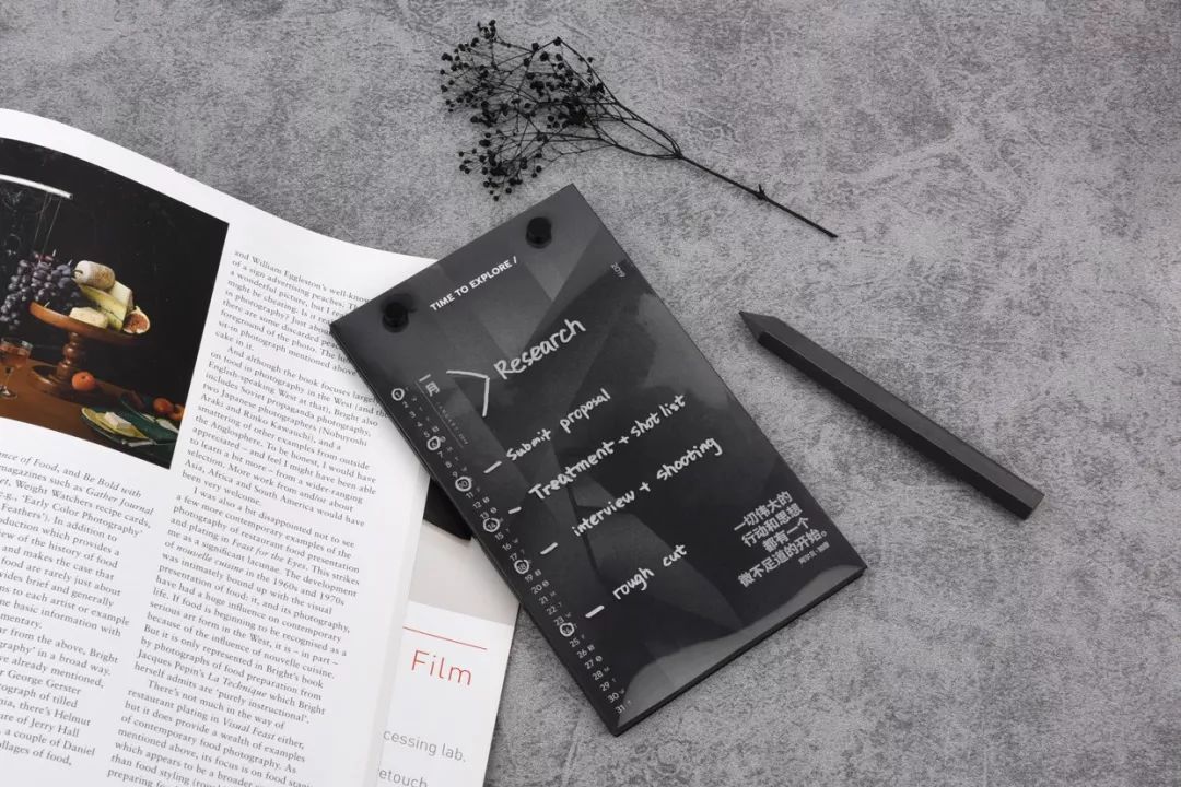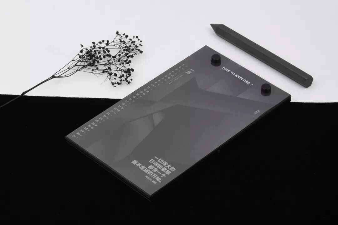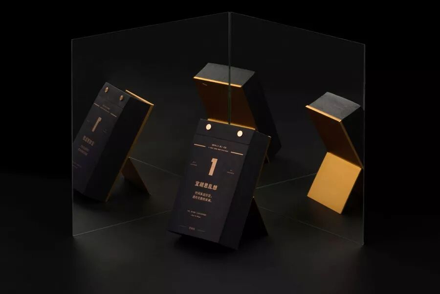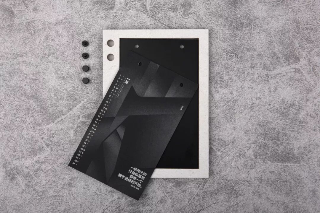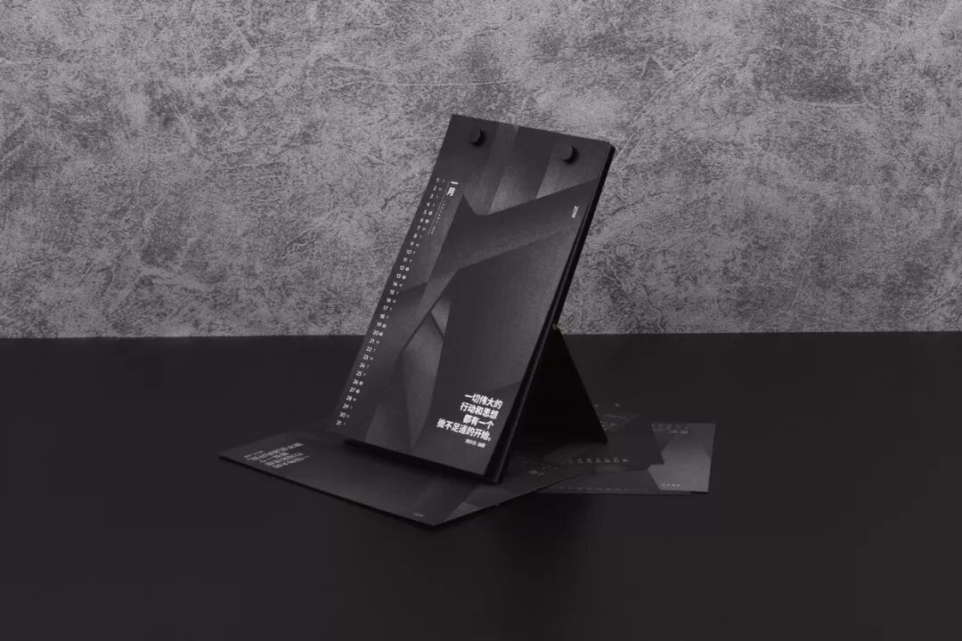 整个月历的设计,只用了一种颜色完成:在黑色纸上专色印银,呈现出极简冷硬的质感,就像每一个新观点一样锐利。