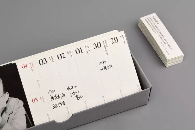 连周历的包装盒都可以得到二次利用。沿包装盒上的虚线撕开并翻转,就可以得到拥有两个卡槽的周历支架,可以把当前一周的卡片放在前面,已经过去的一周卡片放在后面卡槽里。
