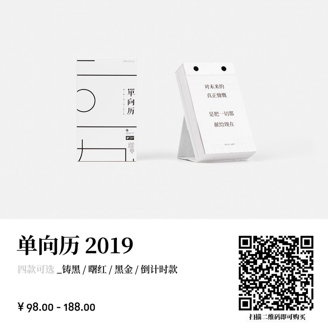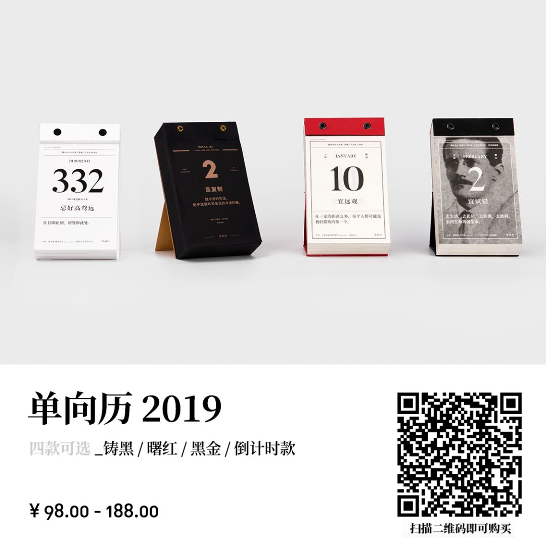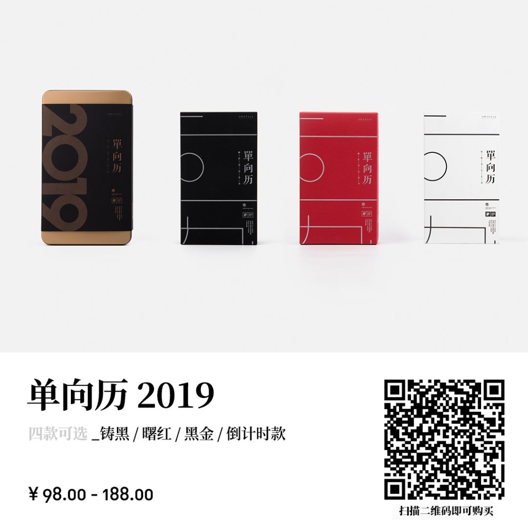 今年开售的单向历 2019,目前有四款可选,分别是铸黑款、曙红款和黑金款和倒计时款,每一款都会给新的一年带来新的惊喜。