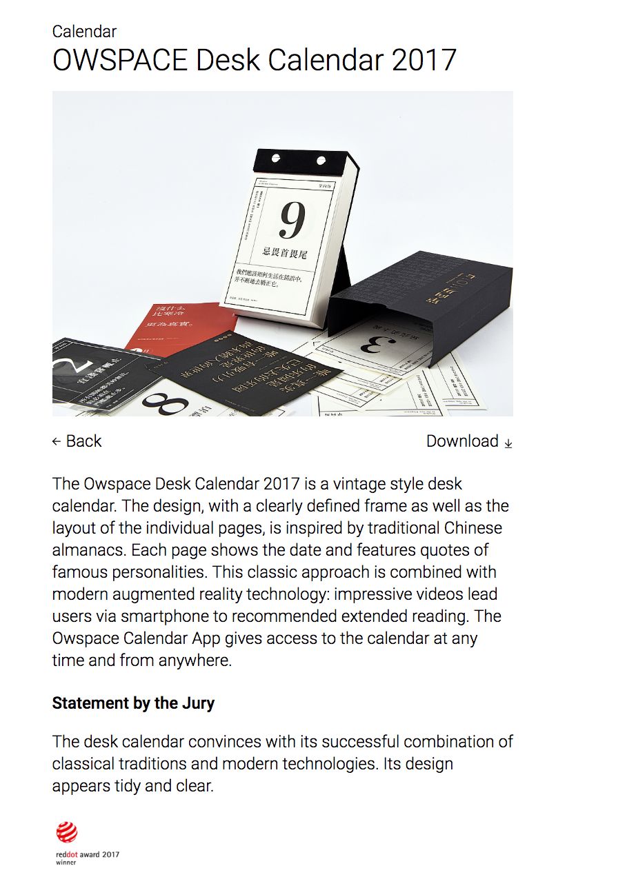 不仅在内容上精雕细琢,单向历在设计上,也获得了国际设计大奖的认可:单向历 2017 获得了德国红点奖、单向历 2018 获得了 iF 设计奖,红点奖评委给单向历的评价是:“这本桌历以经典传统和现代技术的成功结合打动人心,并且以简洁、清晰的设计呈现。”