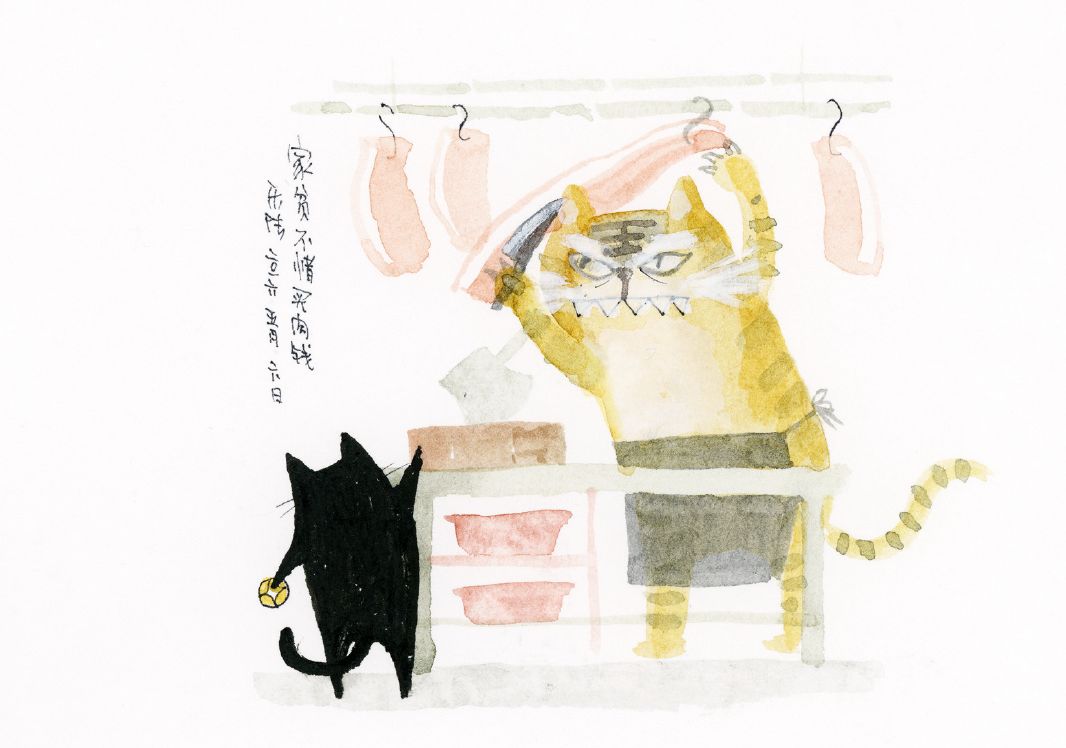 这次向你提供生活建议的,是张乐陆笔下一只水墨风格的、叫做“么么黑”的小猫。“么么黑”是沪语里“至暗之物”的意思,失意之人常把这句话挂在嘴边。张乐陆就通过画猫,来安慰人生当中的至丧时刻。无论是得意还是失意,么么黑总有自己的,属于猫的应对方法。比如说,无论什么经济情况,都要给自己买肉吃!