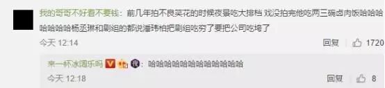 有网友评论潘玮柏当年拍摄的不良笑花,夜景吃大排档场景,戏没拍完他吃两三碗卤肉饭,杨丞琳和剧组的都说潘玮柏把剧组吃穷了,都要把公司吃垮了。