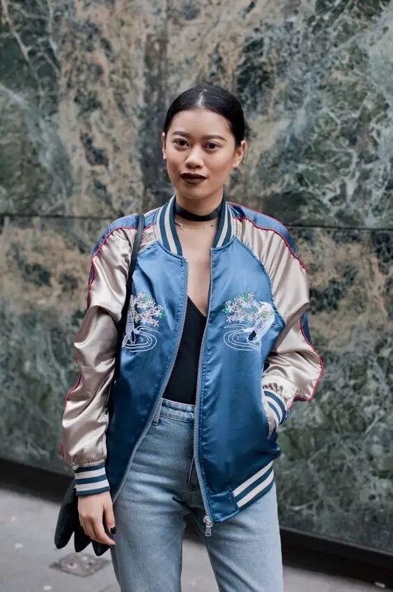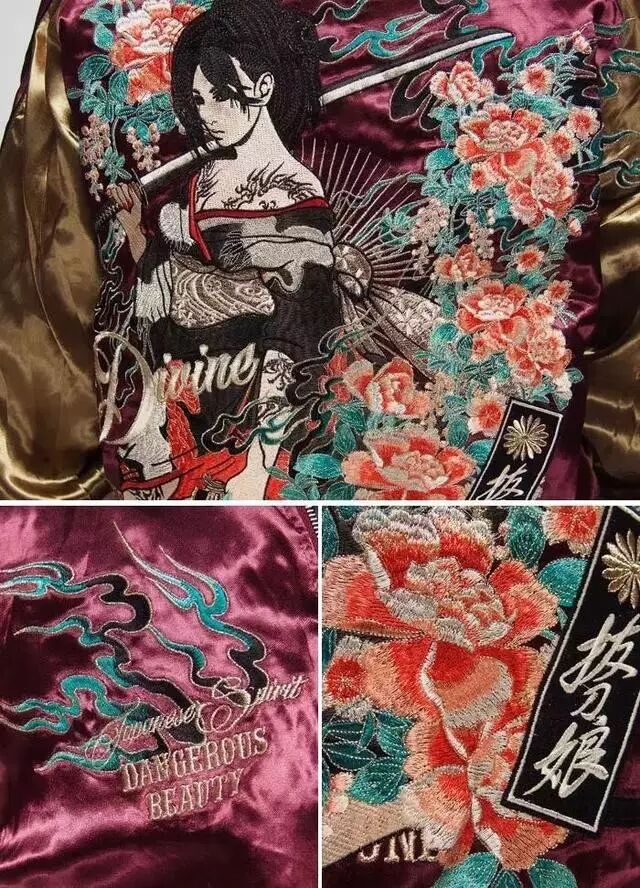 刺绣夹克,英文名souvenir jacket,来源于曾经驻扎在日本的美国大兵,他们在日本住久了,乐不思蜀的,就请当地人在自己的军服夹克外套上绣上精美的东方图腾,并带回家做纪念品。因此它还有个日本名字叫做Sukajan。