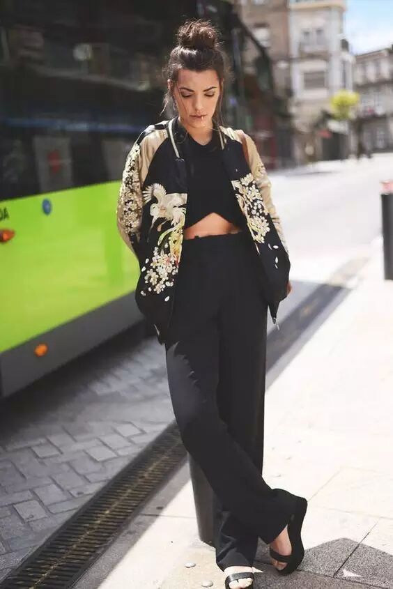 ▲如果不爱小脚裤,高挑的姑娘不妨试试喇叭裤+短短的crop上衣