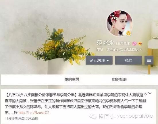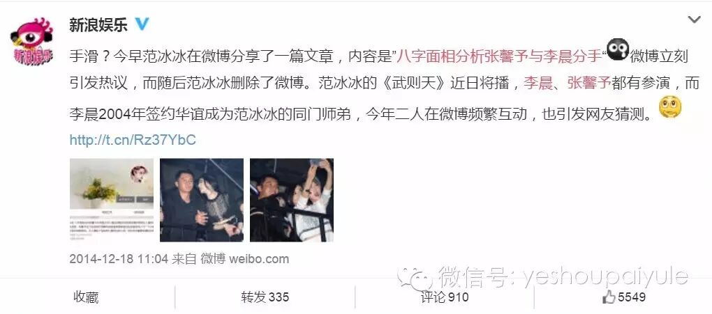 在此之前的12月18日,还发生了一件非常值得玩味的意外事件,范冰冰在微博手滑分享了一篇文章,这可不是一篇普通的文章哦~竟然是《八字面相分析李晨与张馨予分手》,一些人以为是为武媚娘炒作,其实根本不是啊