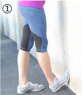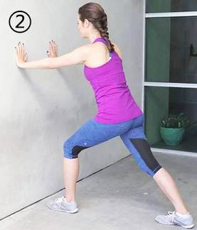 ② 站姿,离墙壁一定距离(大于手臂与墙壁的距离)。左脚向前,右脚向后。曲左膝,右脚伸直,脚后跟压地(如图示)。保持这个动作20-30秒,然后再换另一侧重复。
