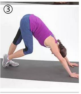 ③ 身体呈倒V字形,手指尽量张开,双脚脚跟尽量压向地面。如果想加深小腿的拉伸强度,可一只脚压向瑜伽垫,另一只脚弯曲。保持这个动作几秒钟,然后换另外一侧重复。每次这个动作总的拉伸时间至少要达到30秒。