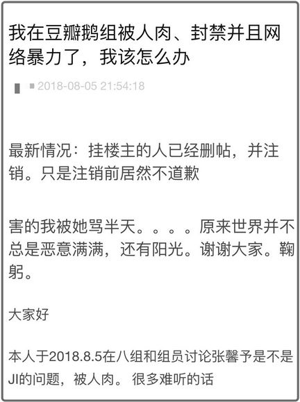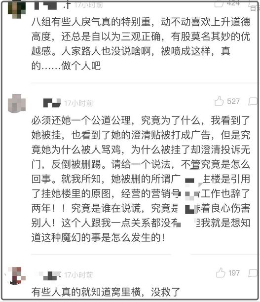 看到这里,我之前那种吃瓜的心态已经完全没有了,更多的是担心,如果这位妹子被人说矫情呢?如果没有人意识到这是一场真正的无妄之灾呢?诚然,我们隔着网线和屏幕,顶着陌生的id,这让大家多了几分放松;但这不是加害者放肆的理由。