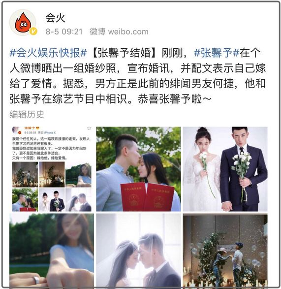 来,现在一个环节一个环节讲,首先是昨天上午话题女星张馨予发微博宣布结婚。