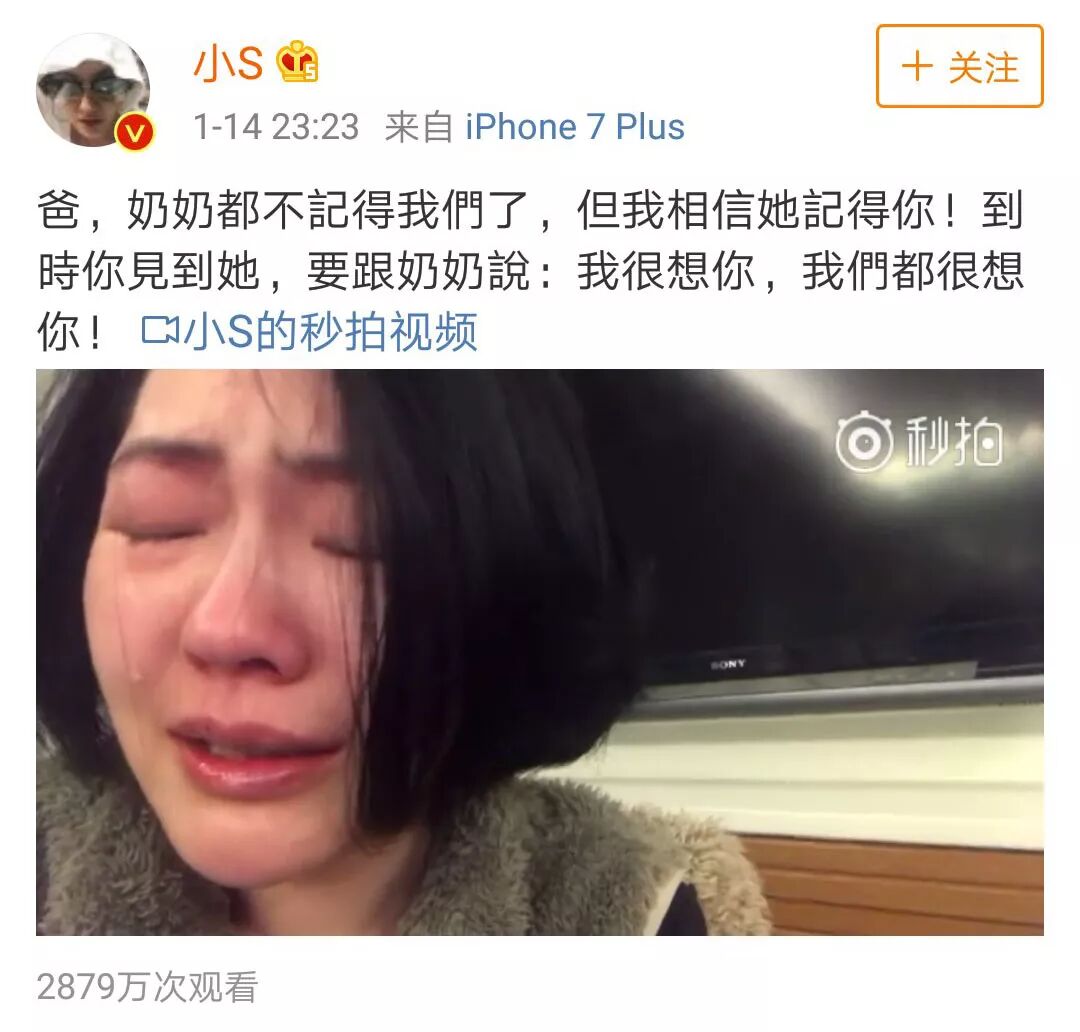 视频里,小S因为奶奶失忆不认识家人,又联想到已经去世的爸爸,控制不住地抽泣、落泪,情到深处连话都说不出。