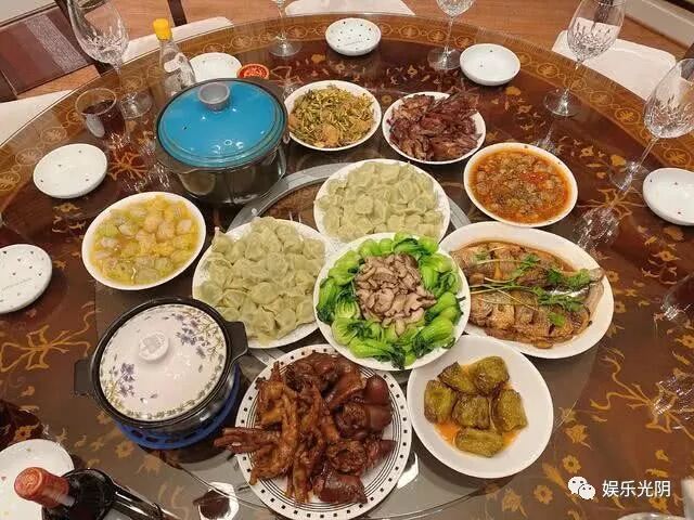 晒出的饭菜也很是家常,作为北方人的舒畅,家里的餐桌上最不能缺少的就是饺子,饭桌上放了两大盘的饺子,还有青菜炒肉、烤鸭、烧鱼、蔬菜、炖猪脚鸡脚等非常常见的菜品。