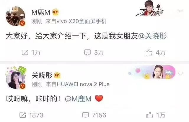 看到这么整齐,就觉得肯定是出大事了,一刷微博,冤有头债有主。鹿晗微博公布与关晓彤恋情。他写道:“大家好,给大家介绍一下,这是我女朋友关晓彤”随后关晓彤也发布微博:“哎呀嘛,咔咔的!@M鹿M”。