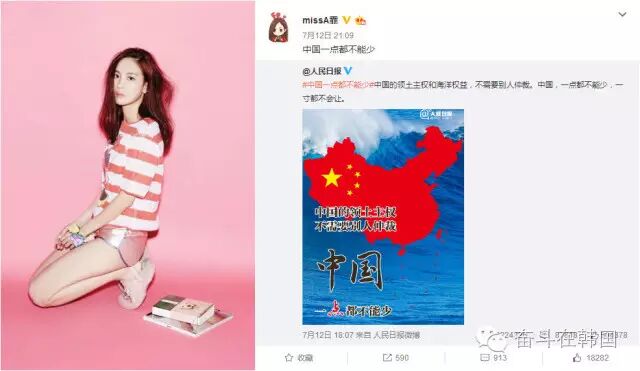 昨日,仲裁结果惹怒民众,宋茜、张艺兴、周觅、曹璐等在韩明星更是纷纷在微博转发人民日报贴文“中国一点都不能少”,表达对仲裁结果的不满。