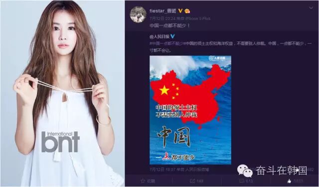 宋茜在ins上为南海仲裁事件发声,作为第一个官方发声的艺人,却被湾湾粉丝狂喷:再也不喜欢你了,别来台湾。
