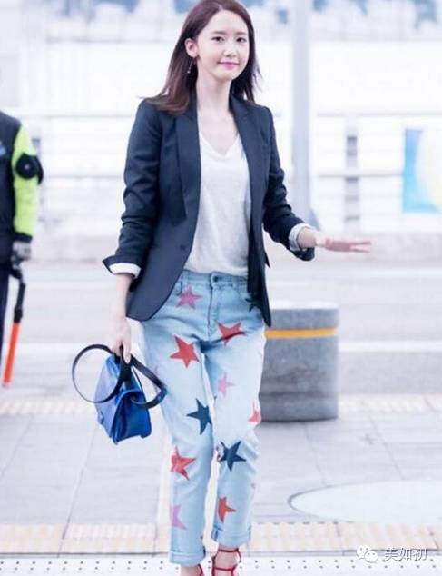 对于拥有168身高,又要大长腿的允儿来说,要穿牛仔裤也是毫无压力的,一身星星图案的牛仔裤,搭配简单的打底衫和深色西装外套,干练十足的LOOK。