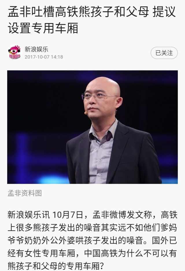 十一期间,《非诚勿扰》主持人孟非因坐高铁被吵,怒发一条微博,微博原文为:高铁上很多熊孩子发出的噪音其实远不如他们爹妈爷爷奶奶外公外婆哄孩子发出的噪声。国外已经有女性专用车厢,中国高铁为什么不可以有熊孩子专用车厢?
