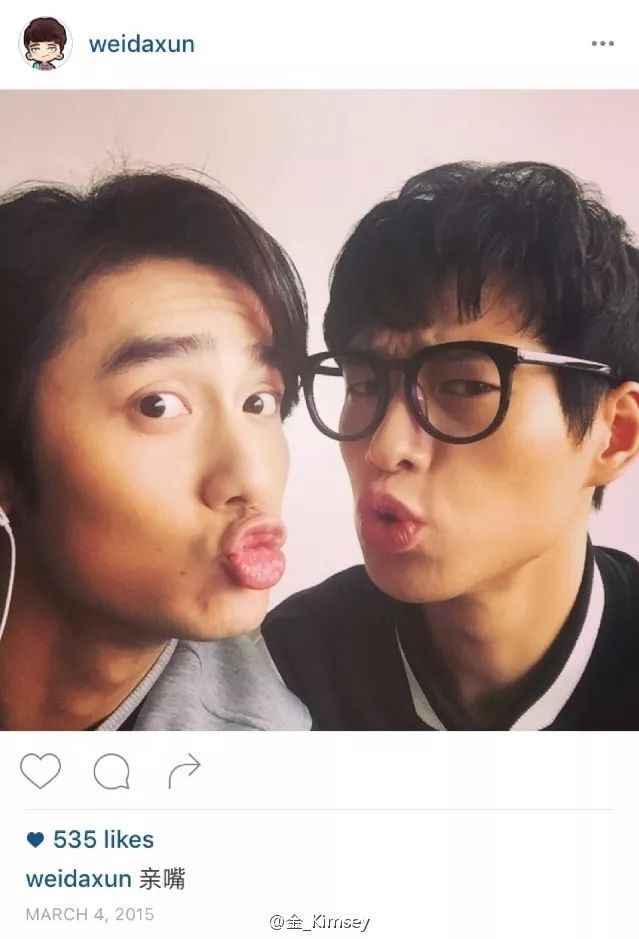 魏大勋发两人噘嘴的合照,还配文“亲嘴”。