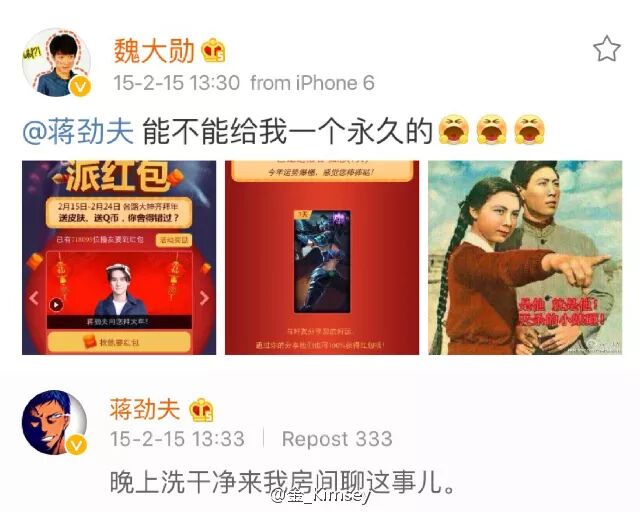 不过,现在蒋劲夫都有女友了,这种互动应该是直男间的恶趣味吧,真正的gay哪有这样明晃晃微博互撩的,男生的世界姨太真的不懂~