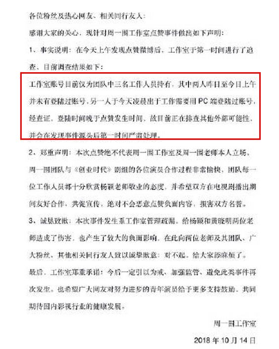 后来周一围工作室道歉,称工作室账号仅为团队三名人员持有,但三人登录微博时间与点赞时间不符,会严肃查处。
