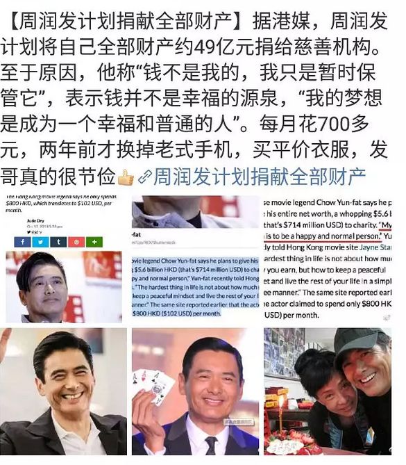 港媒爆周润发在接受香港杂志《Jayne Stars》采访时谈到,计划将自己的全部财产(56亿港元,约人民币49亿)捐给慈善机构。