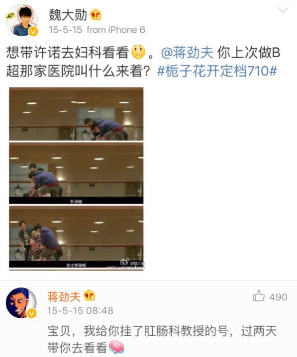 魏大勋发博称带许诺去妇科看看,蒋劲夫称呼魏大勋为宝贝还说给他挂了肛肠科的号。