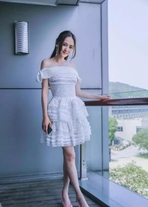 白色的一字肩镂空连衣裙,层叠的镂空设计性感又不失甜美,脚踩粉色的高跟鞋,甜美的小清新气息,这一身真的是完全将她身材的优势凸显出来!