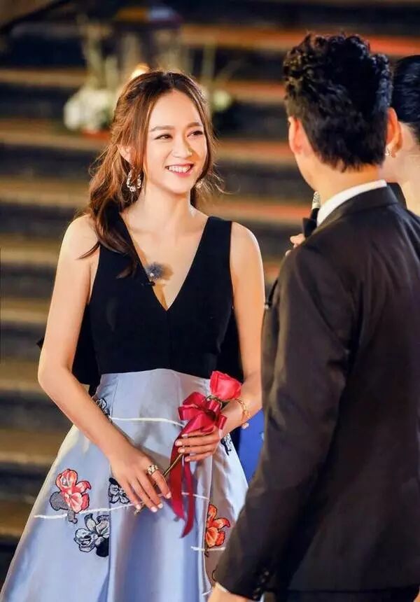 无袖深V的拼接连衣裙,上半身黑色的深V设计将她的香肩酥骨和傲人身材展现出来,下半身天蓝色的印花裙,甜美可爱,搭配精致的妆发,甜甜的笑容,满满女神气息!