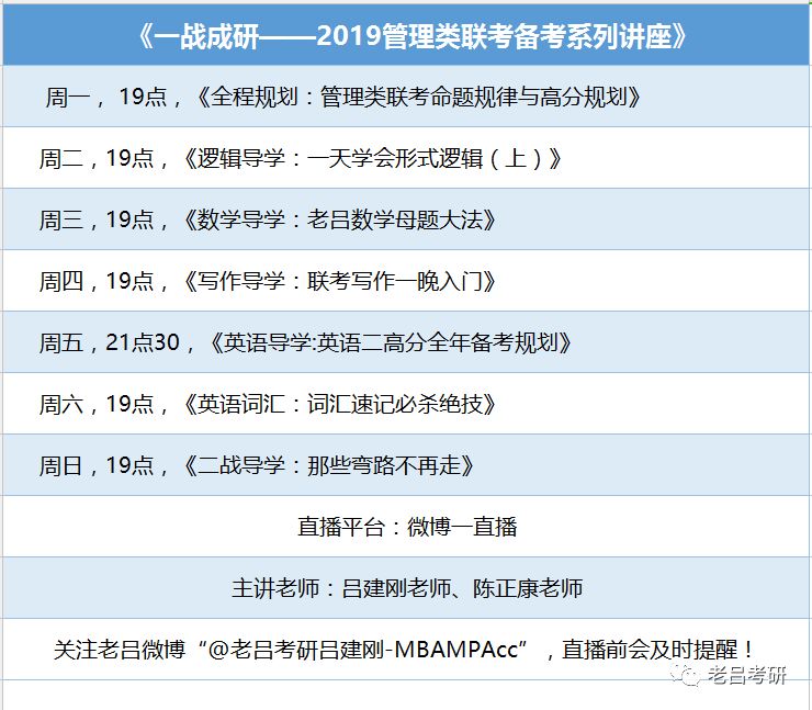 【观看方式】① 关注老吕微博“@老吕考研吕建刚-MBAMPAcc”,到点会有提醒,(记得要特别关注哦。这样每次老吕开直播,都会在微博给你提示哒)